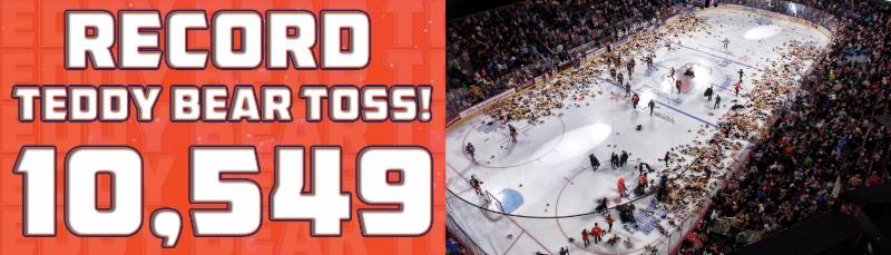 CONDORSTOWN, Calif. – The Bakersfield Condors smashed the record for teddy bears collected at the team’s 19th Annual Teddy Bear Toss Saturday night with 10,549 stuffed animals thrown on the ice. The all-time total is now at 121,395 stuffed animals donated to local non-profit organizations.