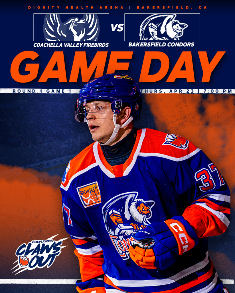 The Bakersfield Condors open the first round (best-of-3) of the Calder Cup Playoffs as the 5-seed against the 4-seed Coachella Valley Firebirds at Dignity Health Arena.
