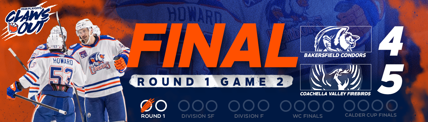 The Bakersfield Condors erased a two-goal deficit with goals 38 seconds apart in the third period, but could not find a game-winner and fell 5-4 to the Coachella Valley Firebirds in Game 2 of their first round series. A deciding Game 3 is tomorrow at 5 p.m.