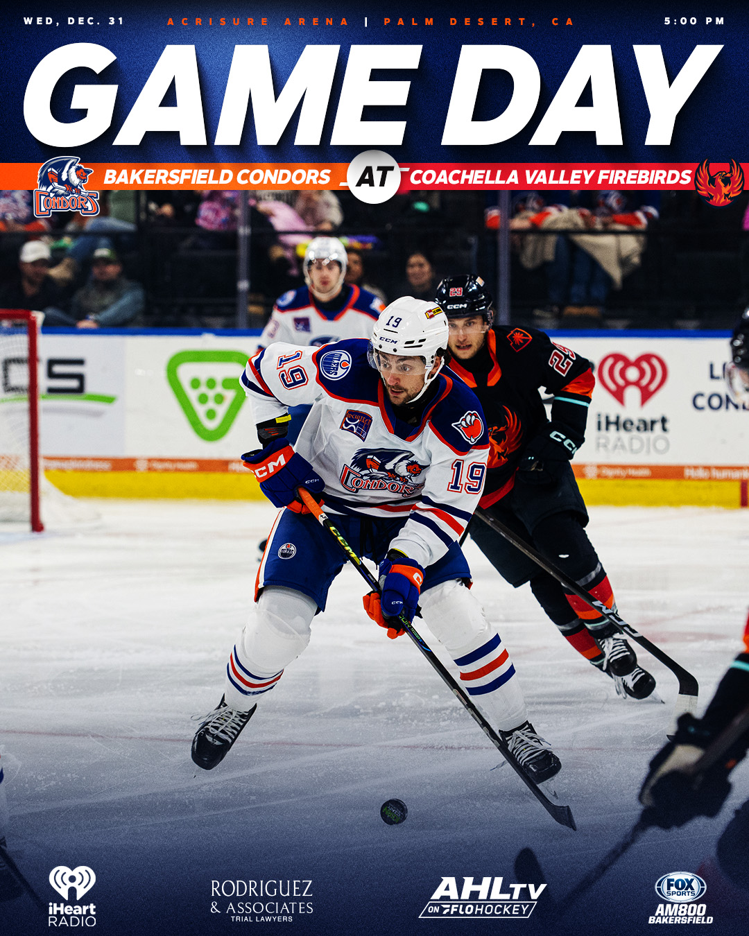 The Condors play their final game of the 2025 calendar year with a New Year’s Eve matchup in Coachella Valley. Bakersfield is 4-1-0 against the Firebirds this season.