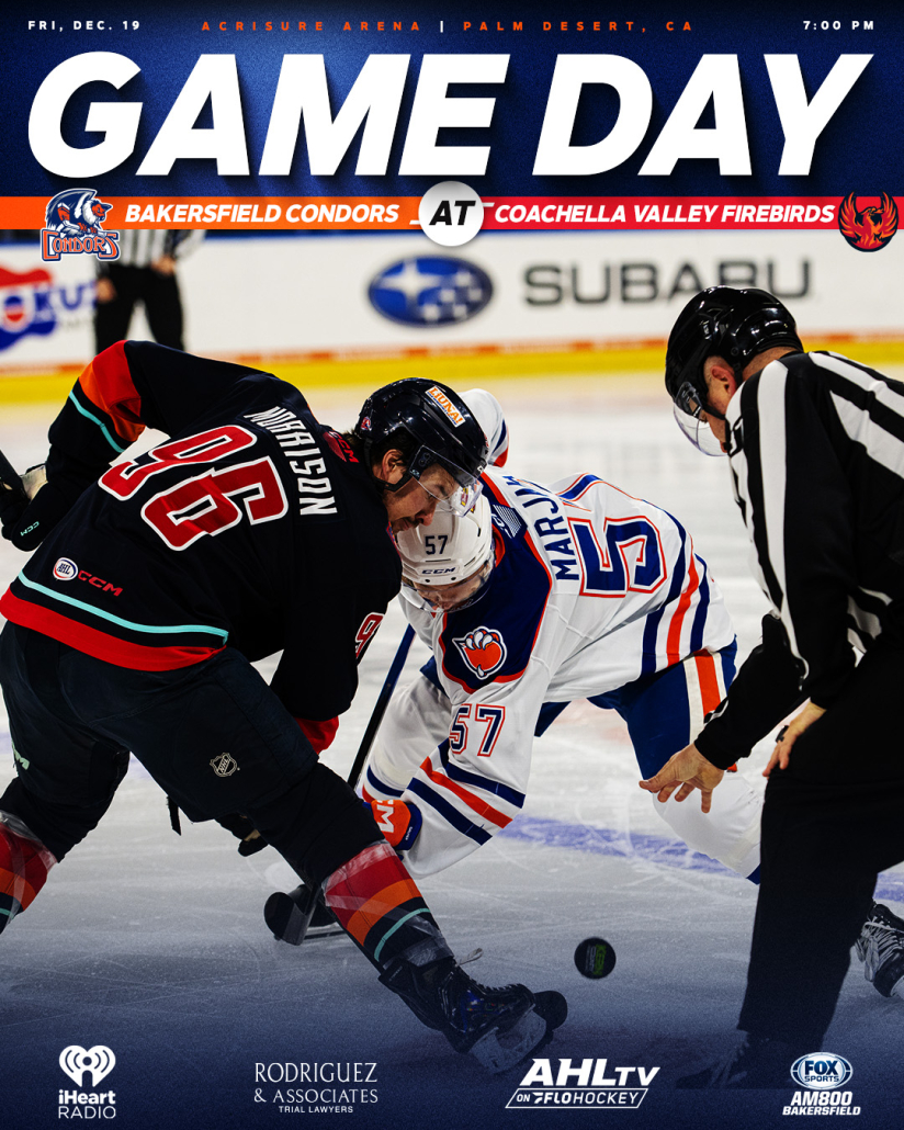 The Condors open a home-and-home series with the Coachella Valley Firebirds in Palm Desert. It is the fourth matchup in the season series with the Condors owning a 2-1-0 mark against the Firebirds.