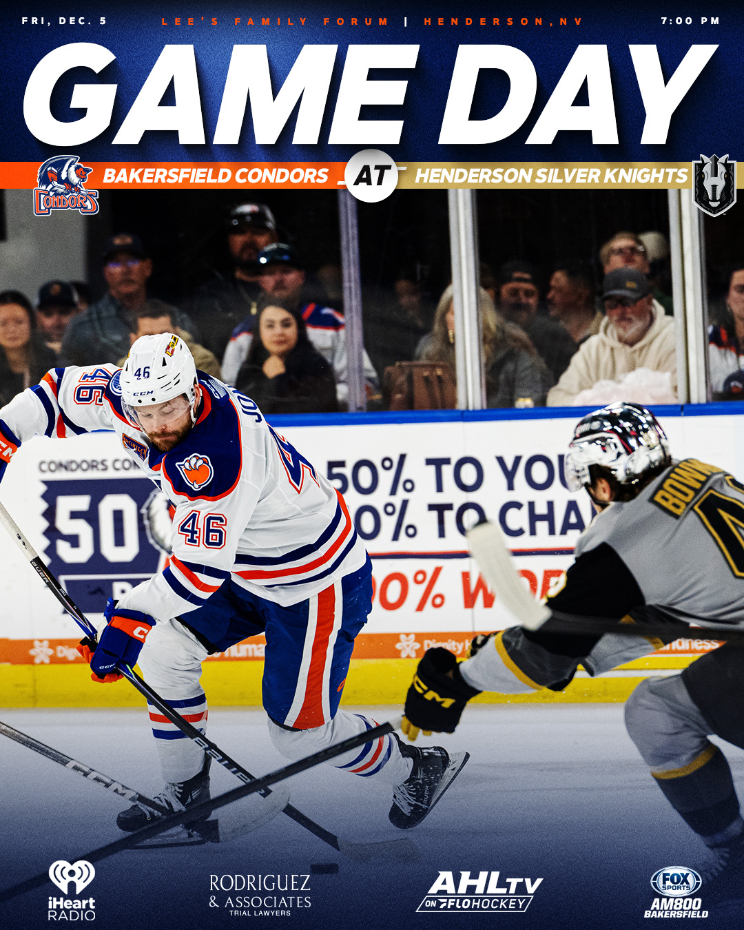 Bakersfield wraps the weekend in Henderson tomorrow at 6 p.m. from Lee’s Family Forum. Catch the action on AM 800 Fox Sports Radio, the iHeartRadio app, or AHLTV on FloHockey.