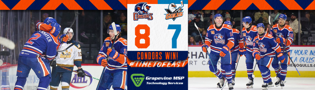 The Bakersfield Condors (6-4-3, 15pts) erupted for their best offensive night of the season and then edged out an 8-7 shootout win over the San Diego Gulls (4-9-1, 9pts) on Saturday. Noah Philp (2g-1a) and Noel Hoefenmayer (1g-2a) each had three point nights. Cameron Wright (4th), Drake Caggiula (5th), Seth Griffith (5th), and Daniel D’Amato (4th) had the other goals for the Condors. Josh Brown’s night included two assists and a team-leading fourth fighting major.