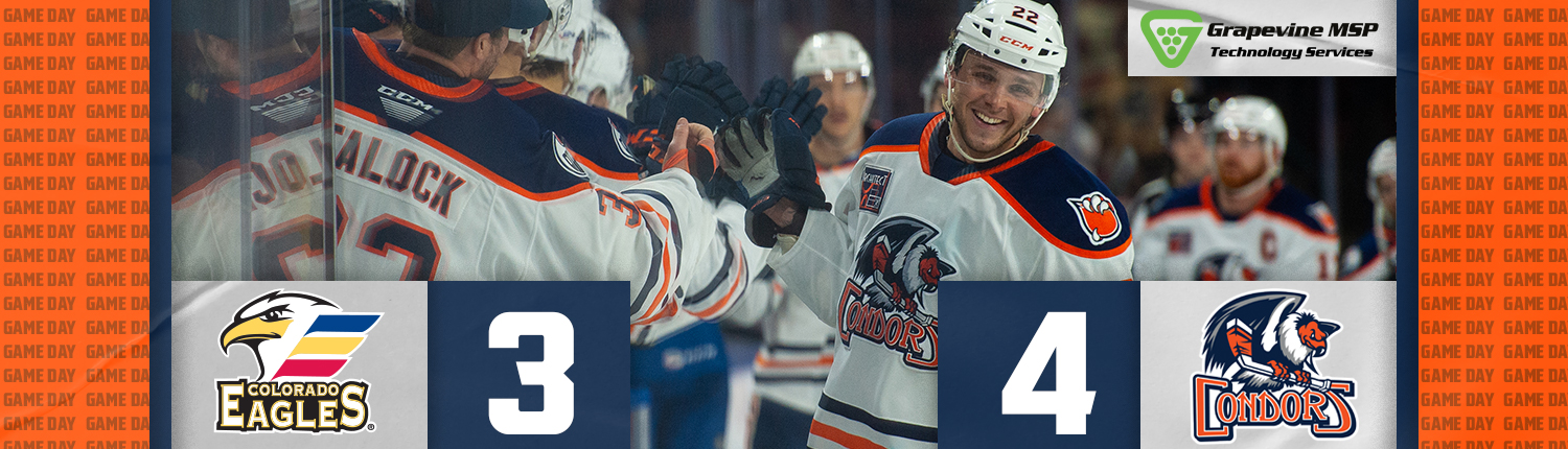 The Bakersfield Condors (18-9-4-3, 43pts) swept the Colorado Eagles with a 4-3 win on Saturday. Graham McPhee scored the game-winning goal and added an assist. Seth Griffith scored twice in the first period for his team-leading 14th and 15th on the year. Brad Malone had two assists and has seven in his last four games.