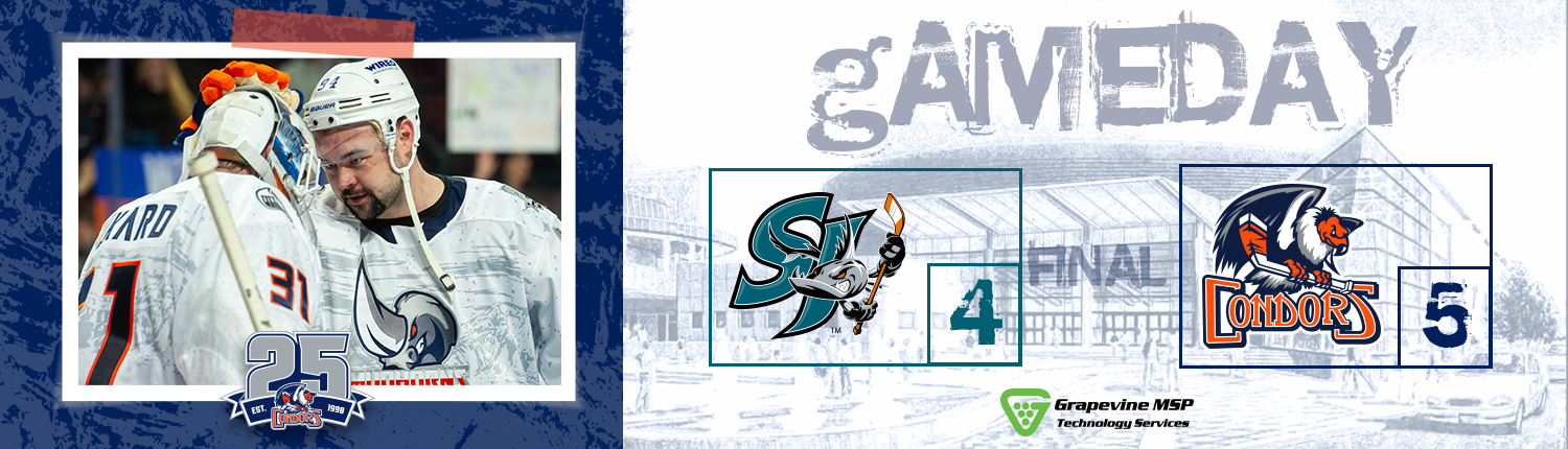 The Bakersfield Condors (16-21-3, 35pts) donned specialty Star Wars themed Mudhorns jerseys and took down the evil scum from San Jose (18-22-3, 39pts) 5-4 on Saturday. A crowd of 7,893 saw the action as the Condors won their second straight and remained unbeaten in four games on home ice.