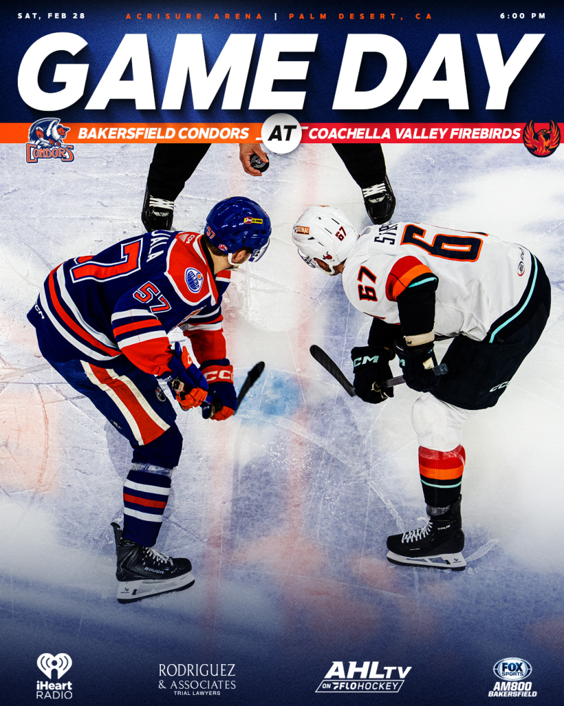 The Condors play game three of a four-game road trip in Coachella Valley at 6 p.m. Bakersfield is 6-1-0 against the Firebirds, with tonight being the eighth and final meeting of the season series.