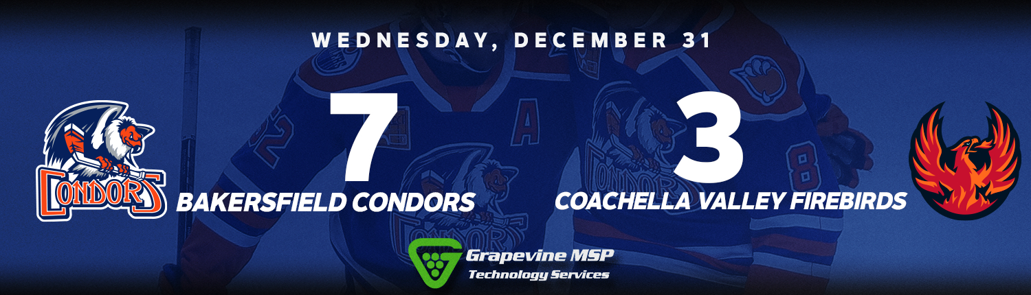 Quinn Hutson tied the Condors rookie goal scoring record with two goals as the Bakersfield Condors (14-10-5, 33pts) closed 2025 with a 7-3 win over the Coachella Valley Firebirds (15-10-4, 34pts) on Wednesday. Samuel Poulin scored twice and Isaac Howard added his four three-point game in his last six contests. Connor Ungar stopped 28 for his second win of the year.