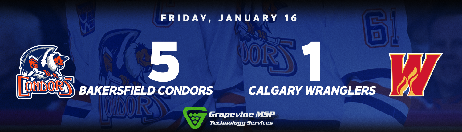 The Bakersfield Condors (20-10-6, 46pts) cruised to a 5-1 win over the Calgary Wranglers (15-15-9, 39pts). Bakersfield has points in eight straight (7-0-1) overall and nine straight on the road (7-0-2). With the win, the Condors have their best record at the midway point of any AHL season.