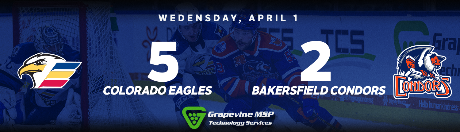 The Bakersfield Condors (34-20-10, 78pts) eight-game home unbeaten run ended at the hands of the Colorado Eagles (39-16-10, 88pts) in front of 5,005 at Dignity Health Arena. Bakersfield remained in fifth in the Pacific Division and lost no ground in the playoff race.