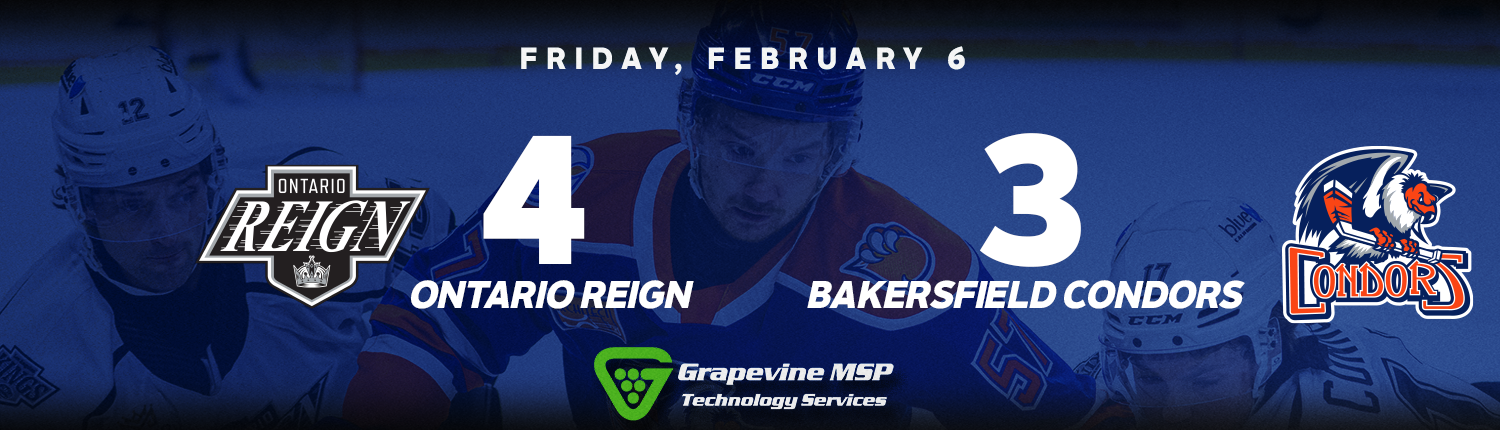 The Bakersfield Condors (25-13-7, 57pts) scored two extra attacker goals but fell 4-3 to the Ontario Reign (30-14-2, 62pts) in front of 5,138 at Dignity Health Arena.