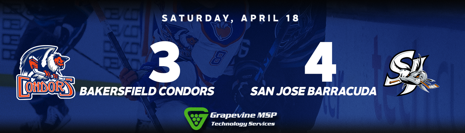 The Bakersfield Condors (37-23-12, 86pts) rallied for overtime and finished the regular season with a 4-3 overtime loss against the San Jose Barracuda (40-28-4, 84pts) on Saturday. Bakersfield is the 5 seed in the upcoming Calder Cup Playoffs and will host Coachella Valley on Thursday in Game 1 at Dignity Health Arena.