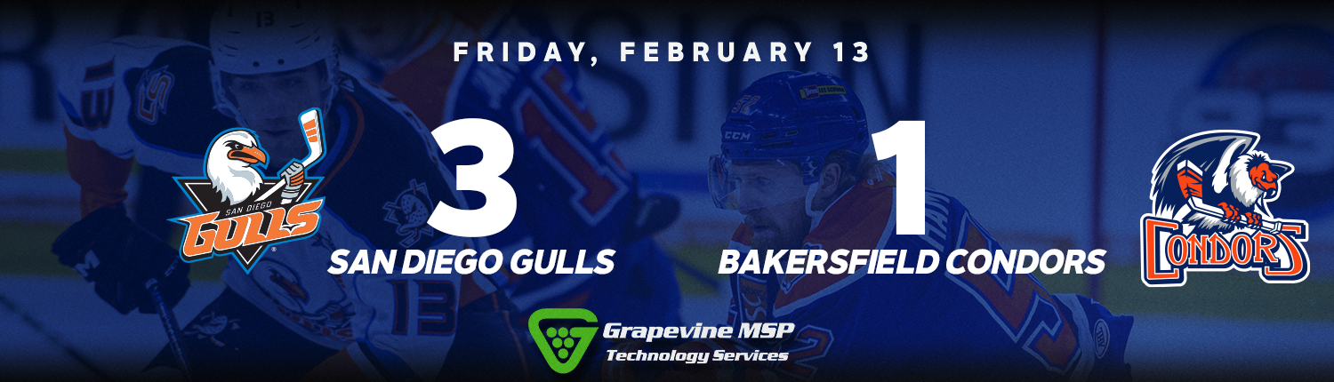 The Bakersfield Condors (25-15-7, 57pts) scored their third extra attacker goal in their last three games, but fell 3-1 to the San Diego Gulls (22-14-9, 53pts) on Friday in front of 5,073 at Dignity Health Arena.
