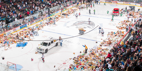 CONDORSTOWN, Calif. – The Bakersfield Condors 17th annual Teddy Bear Toss is Saturday, Nov. 28 and Teddy Bear Toss 3-Packs are on sale now online here or by calling the team’s front office at 324-PUCK (7825). This season Condorstown will surpass 100,000 teddy bears thrown at the annual event for donation to charity.